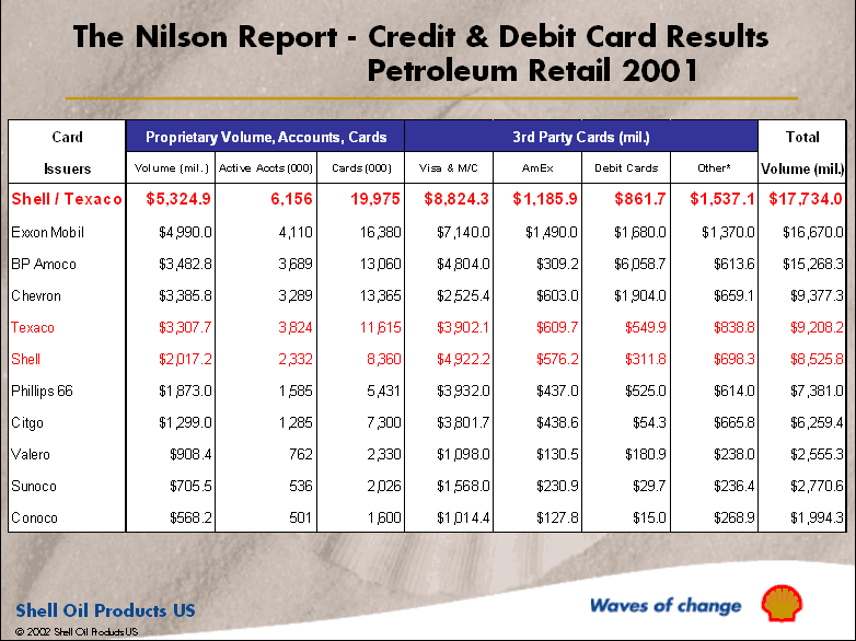 Shell Power. The Brand That Builds Your Business. The kind of success enjoyed by the Shell brand didn’t just happen overnight, and it doesn’t continue simply because of it’s own size and momentum. It has taken generations of experience, innovation and consistent performance. Shell started as a business exporting kerosene to the Far East in 1892 and has become one of the largest retailers of automotive fuels and lubricants in the world. In fact, millions upon millions of consumers around the world repeatedly choose the Shell brand to meet their needs on and off the road, in the air and on the water. The Shell brand image, recognition, quality product, world-class advertising and huge buying power all combine to give our marketers significant and unparalleled advantages as members of the Shell Team. Formula Shell Gasolines. Formula Shell gasolines are a result of one of the most advanced gasoline production technologies available today. These highly advanced fuels are available in three popular grades, Regular, Plus, and Premium. YOU CAN SEE THE DIFFERENCE BETWEEN TIER 1, TIER 3 FUELS – Research Reveals lower-quality fuels at supermarkets, independents (Article excerpted from the Shell Alliance Marketer Magazine): All gasolines are not the same. That’s the inescapable conclusion reached by researchers at Shell’s Westhollow Technology Center after recent tests using vehicle engines adapted to run on two fuels simultaneously. The side-by-side tests showed Formula Shell gasolines kept the engine cleaner, allowing it breathe properly and helping to maintain emissions control and reduce the risk of additional maintenance. “These tests target some of the fuels being offered at supermarkets and independents,” explains Simon Foster, fuels category manager at Shell. “Some consumers become enticed by the lower prices offered by such competitors, and we felt compelled to show, through research, the differences between the various tiers or levels of gasoline quality.” Formula Shell gasolines qualify as Tier 1 Fuels, he says, which contain additives that actually clean up engines. At Tier 2 are fuels that tend to keep engines clean, but not to the degree that Tier 1 fuels do. Tier 3 gasolines contain only enough detergents and other additives to meet government regulations. The first Westhollow tests used a 1996 Dodge truck eight-cylinder engine that was set up to run 10,000 lab-simulated miles with four cylinders operating on Formula Shell gasoline and the other four on a Tier 3 gasoline offered at a supermarket chain. The differences on the inlet valves are startling: The supermarket fuel left the valves covered with deposits, while Formula Shell gasoline kept the valves clean and bright. Further tests with a variety of supermarket and independent c-store gasolines have given similar results. Recently, Shell also conducted a “5 Tanks” test against three competitors’ fuels in 16 vehicles (four each of four different makes) picked at random from a rental car dealer. In stage one, all of the cars were operated on five tanks of a competing fuel; during this time, all of the engines’ valves grew at least 25 percent dirtier. At stage two, 12 of the cars were switched to Formula Shell gasoline for five tanks; as a control, the four remaining cars continued on the competing gasolines. After five tanks, the 12 cars on the Formula Shell gasoline became 15 percent cleaner; the control cars kept getting dirtier. “Once we start conveying this information to the motoring public,” says Foster, “our aim will be clear: to give consumers greater faith in the superiority of our products.” There is a difference between gasolines. Experience the Difference! Try FIVE tanks of the new Waves of Change Formula Shell Gasoline at a Shell retailer near you. Shell’s new gasoline has more clean system additives than ever before! We dare you to increase your vehicle’s performance and mileage by trying five tanks of Formula Shell. The Power of the Shell Credit Card: Shell’s growth with Proprietary Credit Cards (The Shell Credit Card), Shell Fleet Cards, Shell MasterCards, and Shell Pre-Paid Cards has been OUTSTANDING! Shell is positioned on the top for a number of reasons: